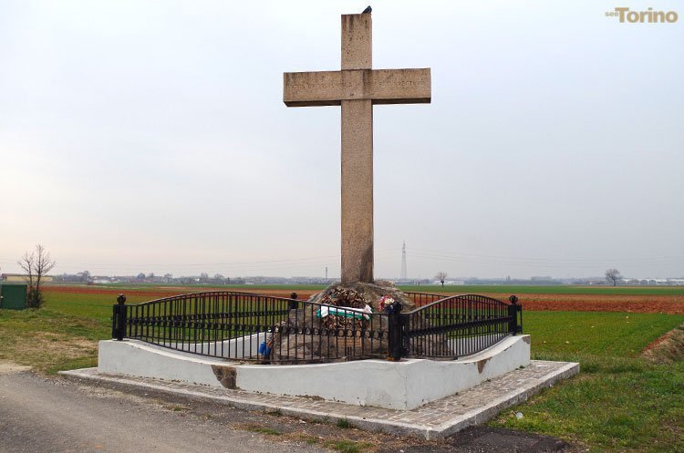 La croce fu posta nel 1913 su iniziativa del conte Ludovico Laderchi, al centro del luogo della battaglia – tragicamente cruenta quanto inutile – combattuta il 4 ottobre 1693 fra i soldati francesi guidati dal maresciallo Catinat ed i Piemontesi comandati dal duca Vittorio Amedeo II di Savoia che lì subirono una pesante sconfitta.