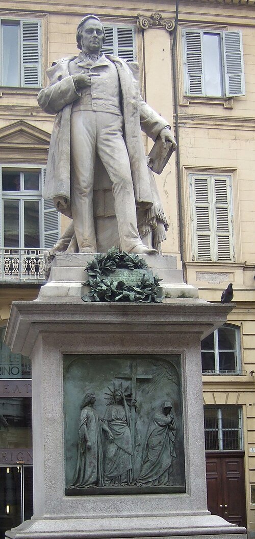 Il monumento allo statista fu collocato nel 1873 al centro di Piazza Carlo Emanuele II, nota come Piazza Carlina. Il monumento, alto 14,2 m, fu realizzato con marmo di Carrara e granito di Baveno e bronzo dallo scultore toscano Giovanni Duprè (1817 – 1882).