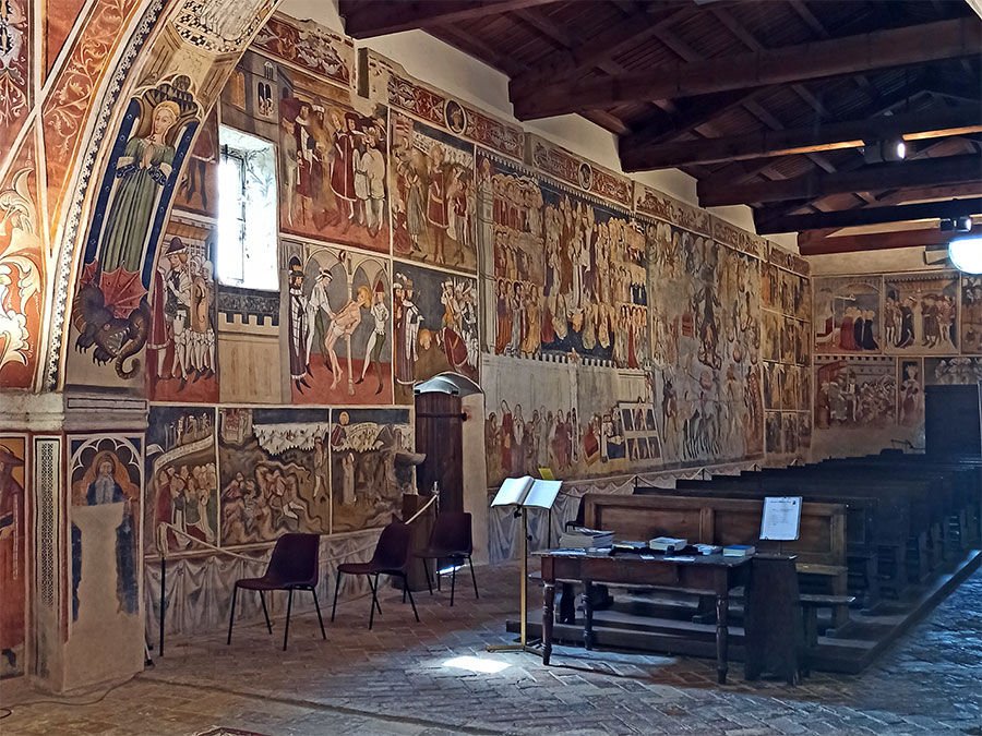 La chiesa ha le pareti interne completamente coperte da 326 mq di splendidi affreschi del secolo XV che rappresentano il ciclo più esteso del Piemonte, ripartiti in 51 riquadri, più le figure nel presbiterio.